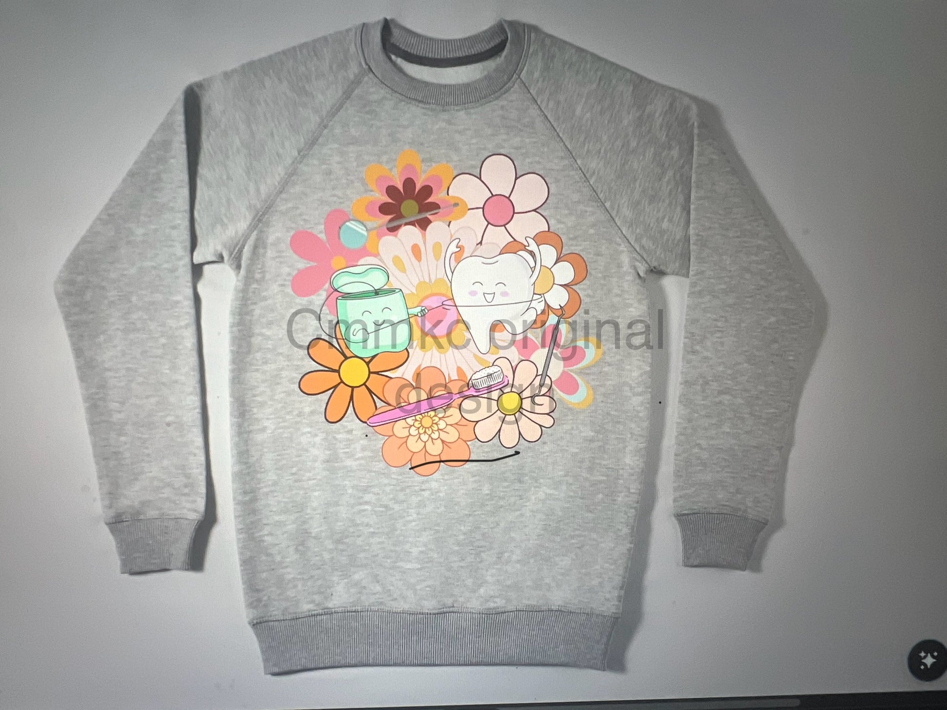 This fun retro, dental themed Spring DTF print can go on either a tee or a sweatshirt for those of you that keep a cold office. Gildan GRAY unisex fit tee and sweatshirts