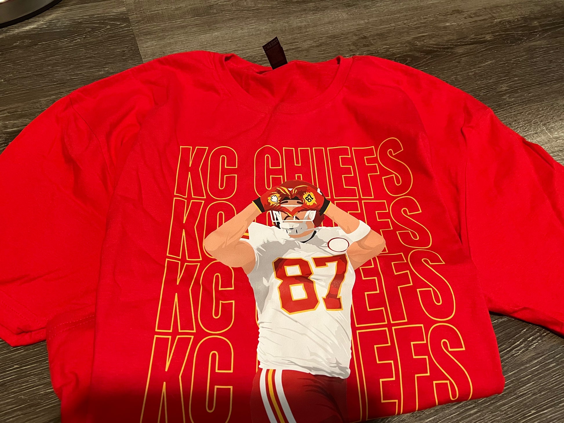 Red Xl gildan softstyle Kelce heart hands.