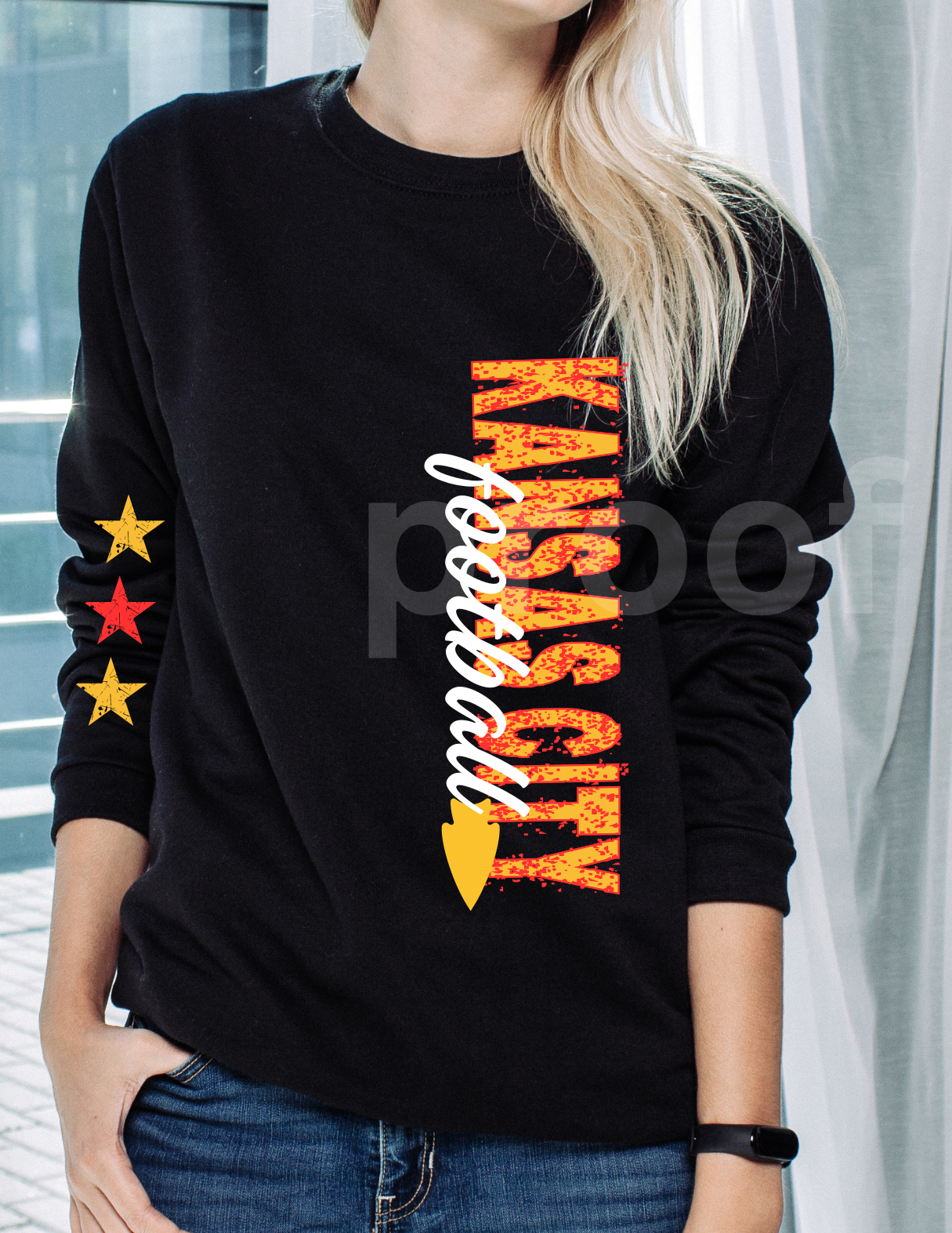 This sideways print is fun and cute! With KC football on the front and starts on the opposite arm. Unisex fit.