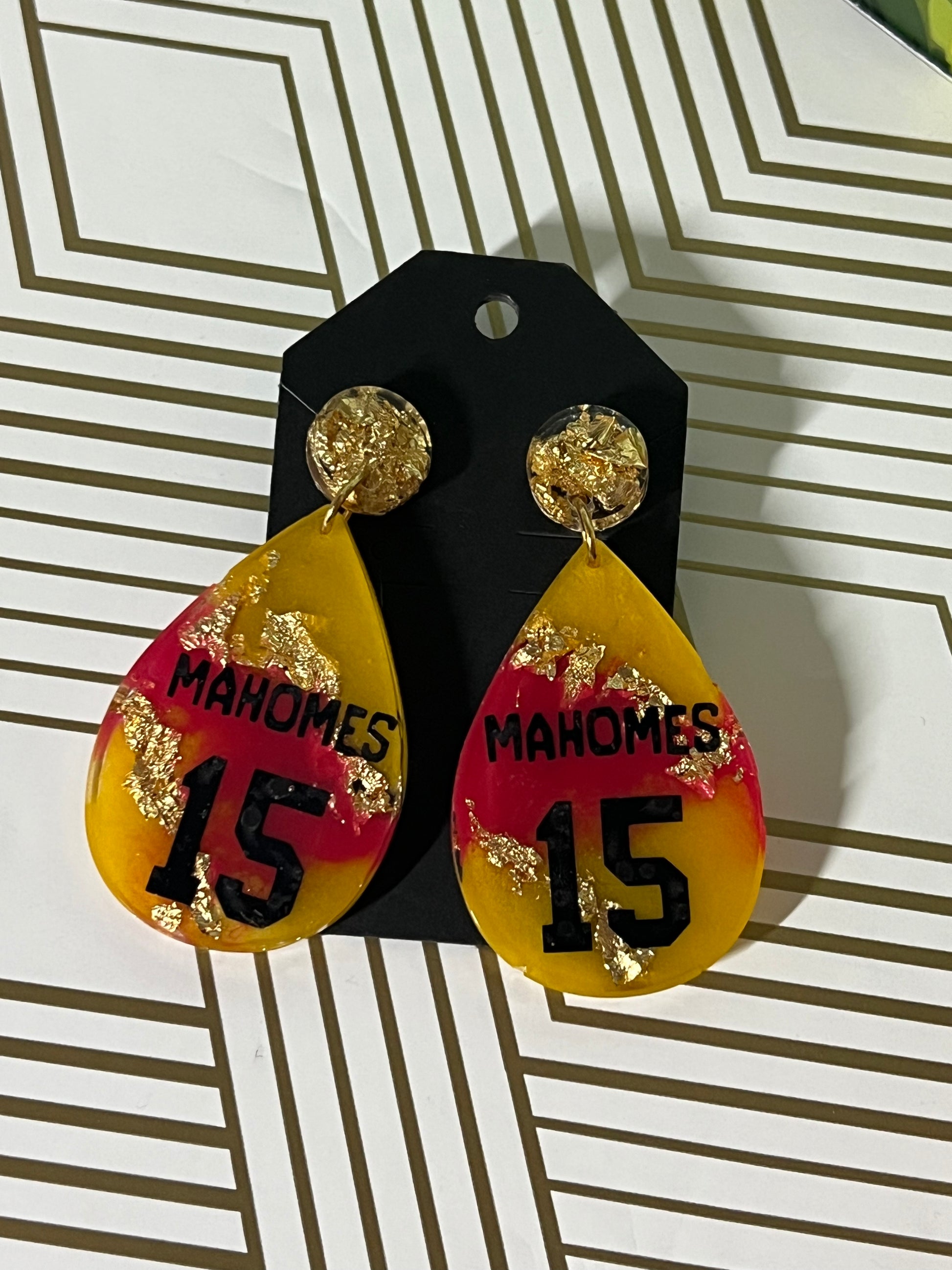 Mahomes 15 gold post, resin earrings. red and gold with gold metallic flakes. Nickel free