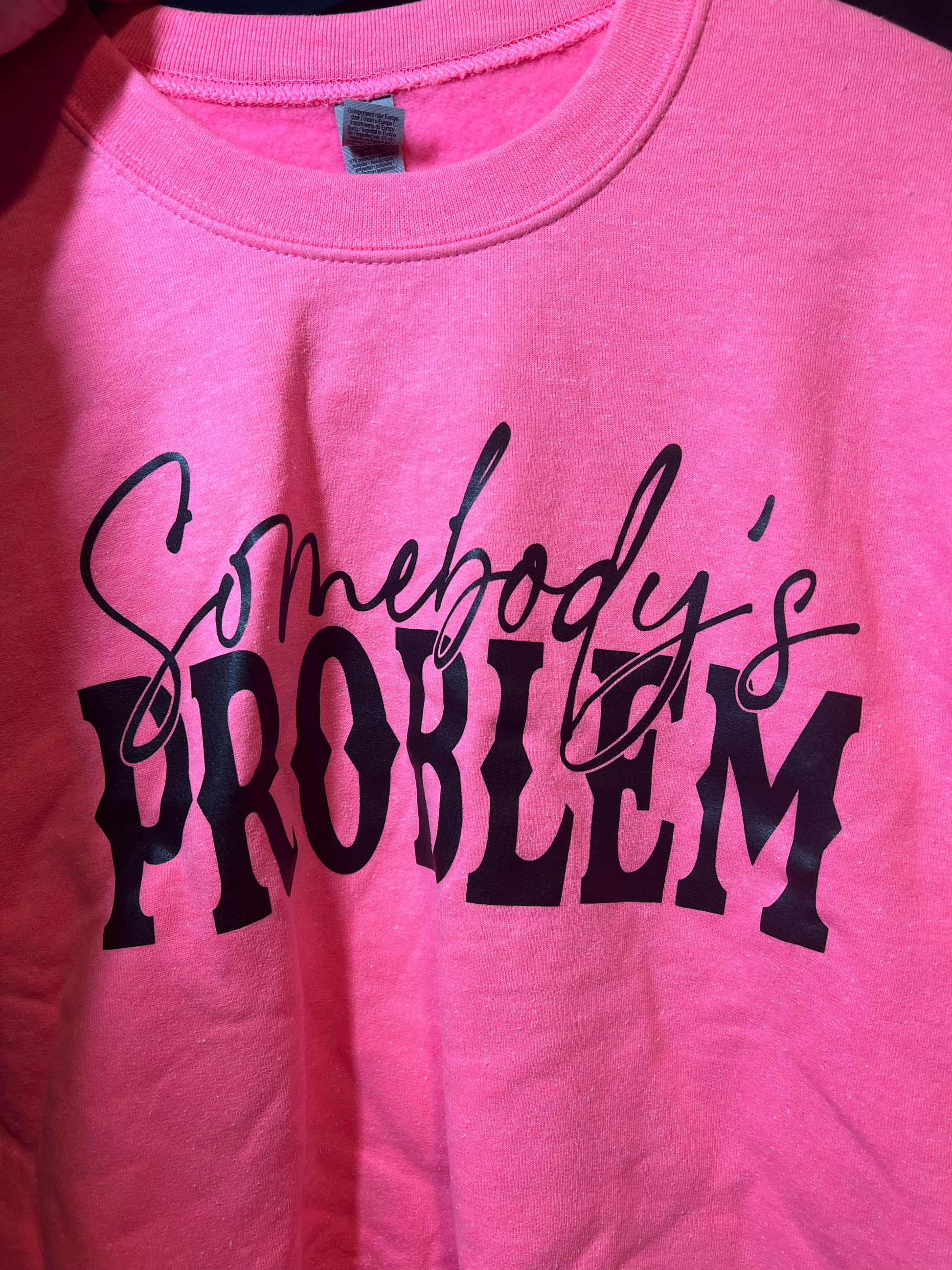 "Make your problem somebody else's with this hot pink sweatshirt. Featuring a playful Somebody's Problem print, this Gildan unisex sweatshirt is perfect for those who don't take themselves too seriously. Add a pop of color and humor to your wardrobe with this medium-sized sweatshirt."