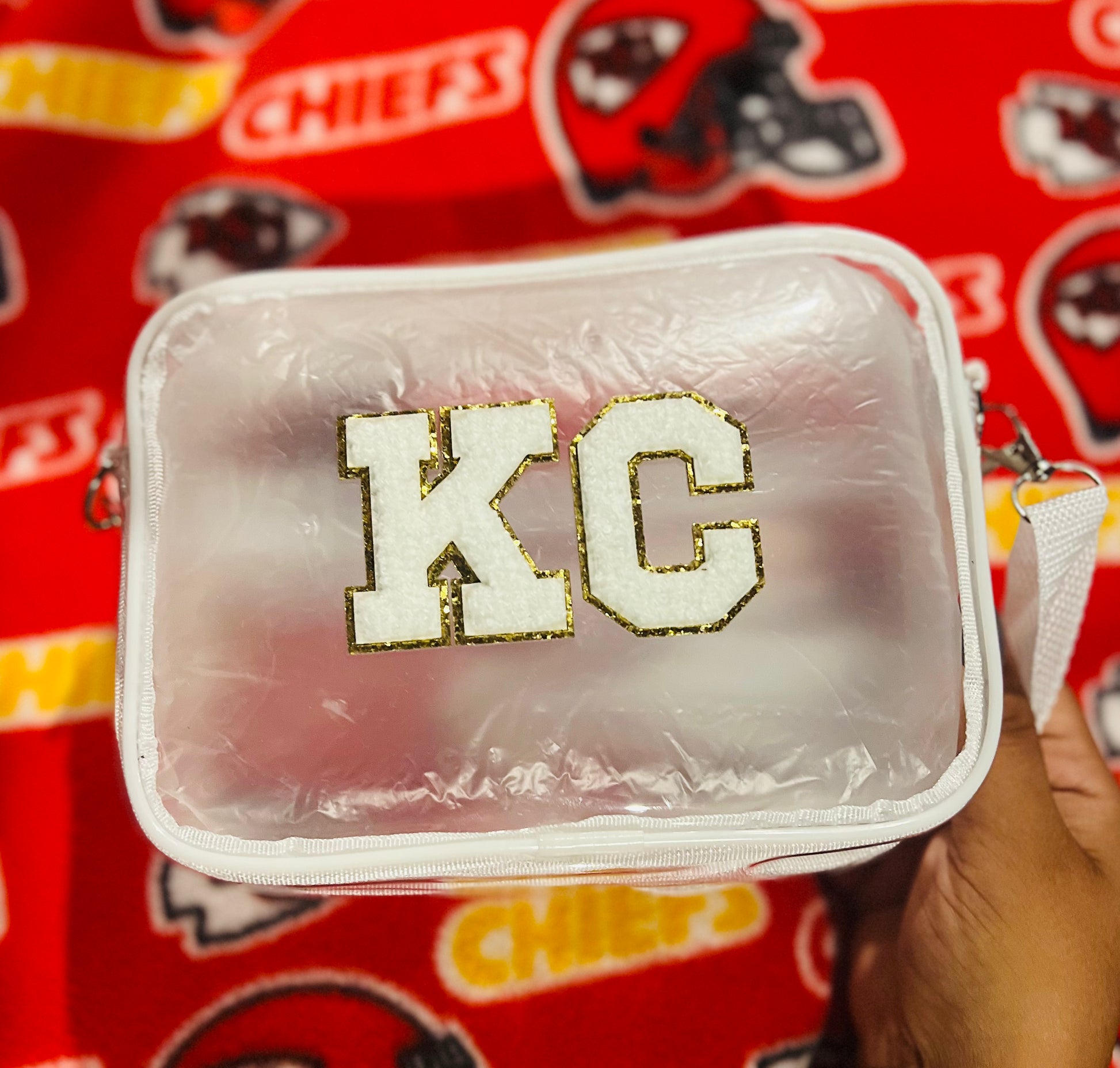 Clear bag with white trim. White chanelle letters with gold outline. Zips open and one zipper pocket in the back.