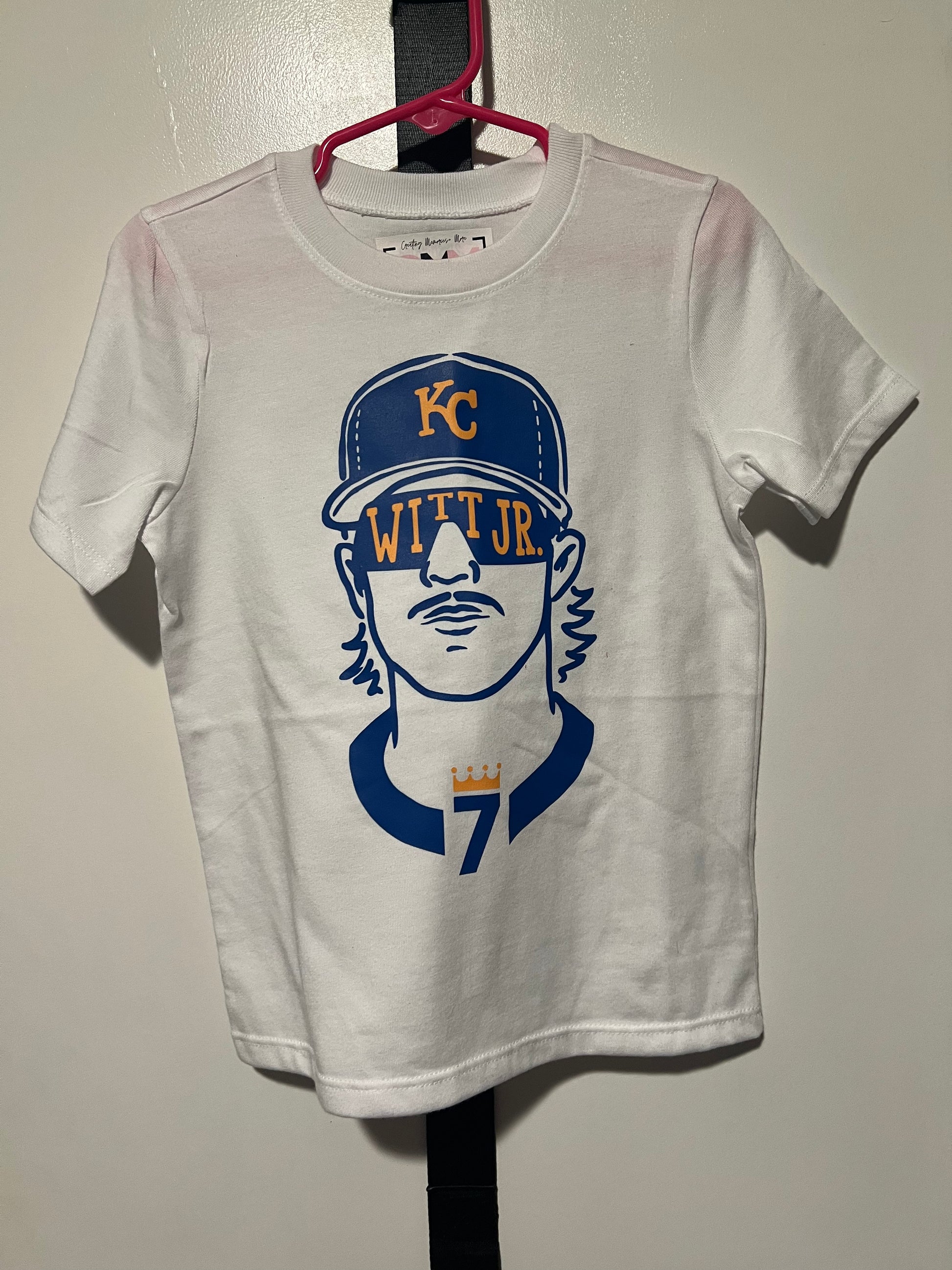 Kid size white T-shirt with DTF Printed image of Bobby Witt.